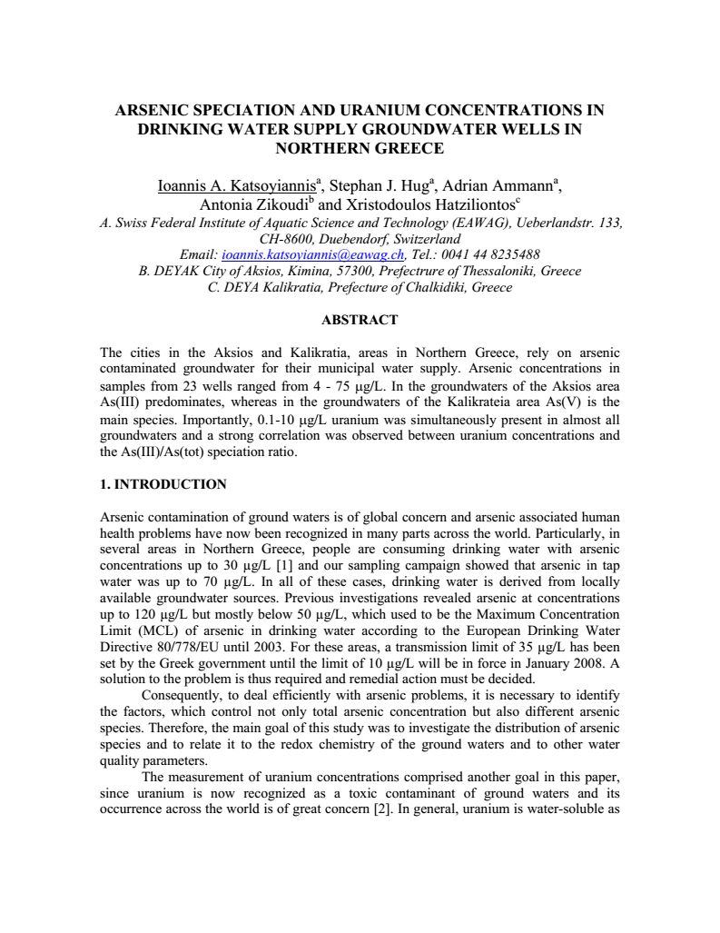 Arsenic speciation and uranium concentrations in drinking water 3 supply wells in Northern Greece: Correlations with redox indicative 4 parameters and implications for groundwater treatment