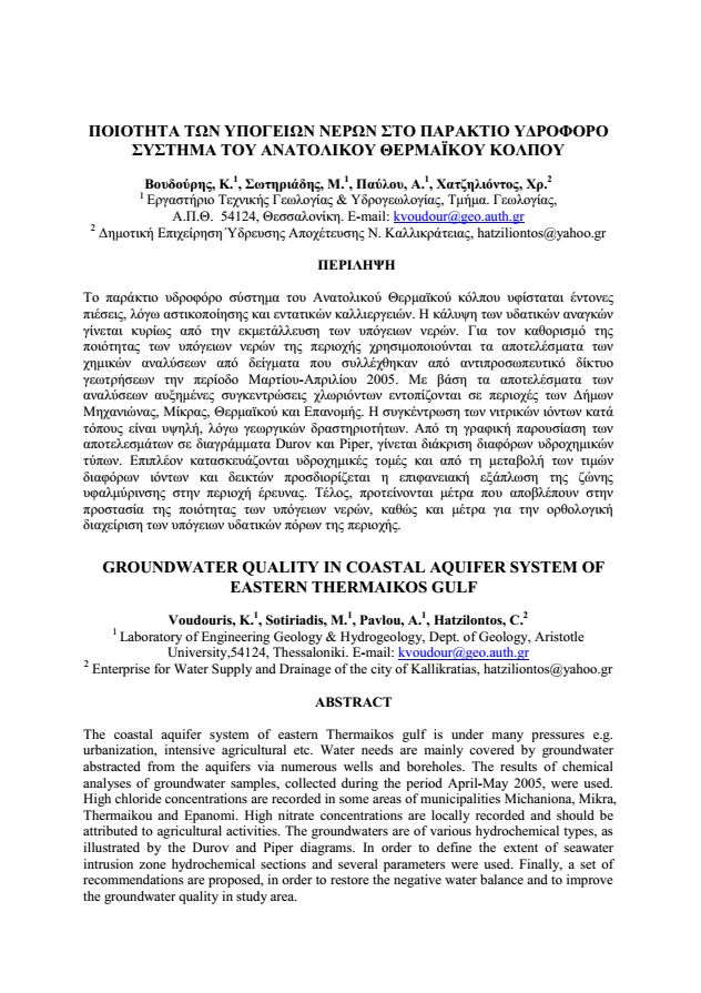 Ένωση Ελλήνων Χημικών – Περιφερειακό Τμήμα Κεντρικής & Δυτικής Μακεδονίας, 2005 - ΠΟΙΟΤΗΤΑ ΤΩΝ ΥΠΟΓΕΙΩΝ ΝΕΡΩΝ ΣΤΟ ΠΑΡΑΚΤΙΟ ΥΔΡΟΦΟΡΟ ΣΥΣΤΗΜΑ ΤΟΥ ΑΝΑΤΟΛΙΚΟΥ ΘΕΡΜΑΪΚΟΥ ΚΟΛΠΟΥ