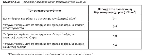 4.4.4. Αερισμός μη θερμαινόμενων και ηλιακών χώρων: Για τους μη θερμαινόμενους χώρους ή ηλιακούς χώρους, σύμφωνα με το πρότυπο ΕΛΟΤ EN ISO 13789 Ε2:2009, ο συνολικός αερισμός των χώρων (φυσικός αερισμός και διείσδυση), λαμβάνεται από τον πίνακα 3.25., ανάλογα με την περίπτωση.