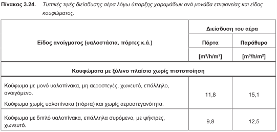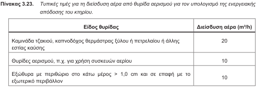 4.4.2. Αερισμός λόγω αεροστεγανότητας (διείσδυσης του αέρα): Ο αερισμός λόγω αεροστεγανότητας του κτηρίου ή θερμικής ζώνης (διείσδυσης του αέρα), πραγματοποιείται μέσω των χαραμάδων των κουφωμάτων του κελύφους (συναρμογές κουφωμάτων με περιμετρικά δομικά στοιχεία, συναρμογή κινητών φύλλων κουφωμάτων) ή των θυρίδων αερισμού (για συσκευές αερίου) ή των καμινάδων εστιών καύσης (τζάκι, θερμάστρα πετρελαίου ή ξύλων κ.ά.), καθώς επίσης και από τους αρμούς των δομικών αδιαφανών επιφανειών του κτηρίου. Για τους υπολογισμούς του αερισμού λόγω αεροστεγανότητας η διείσδυση αέρα μέσω των δομικών αδιαφανών εξωτερικών επιφανειών του κτηριακού κελύφους θεωρείται αμελητέα και λαμβάνεται ίση με μηδέν. Ο αερισμός μέσω θυρίδων αερισμού ή καμινάδων εστιών καύσης (τζακιού, θερμάστρας ξύλων ή πετρελαίου κ.ά.), λαμβάνονται κατά περίπτωση και σύμφωνα με το αριθμό των θυρίδων τού υπό μελέτη ή προς επιθεώρηση κτηρίου. Στον πίνακα 3.23. δίνονται τυπικές τιμές για τη διείσδυση αέρα ανά θυρίδα αερισμού, που θα λαμβάνεται υπόψη στους υπολογισμούς ενεργειακής απόδοσης κτηρίου, τόσο στο υπό μελέτη ή προς επιθεώρηση κτήριο, όσο και στο κτήριο αναφοράς.