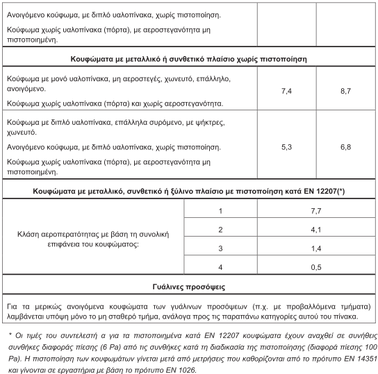 Κατά τη μελέτη ή την επιθεώρηση ενός κτιρίου και προκειμένου να γίνει ο υπολογισμός της ενεργειακής του απόδοσης καταγράφεται ο τύπος όλων των κουφωμάτωνκαι η συνολική επιφάνεια για κάθε κούφωμα. Από τον παραπάνω πίνακα επιλέγεται η κατάλληλη τιμή του συντελεστή διείσδυσης του αέρα για κάθε κούφωμα και πολλαπλασιάζεται με τη αντίστοιχη επιφάνειά του για να προκύψει η διείσδυση αέρα από κάθε κούφωμα. Η συνολική διείσδυση αέρα για το κτήριο είναι το άθροισμα της διείσδυσης αέρα όλων των ανοιγόμενων ή μερικώς ανοιγόμενων κουφωμάτων που έρχονται σε επαφή με τον εξωτερικό αέρα. Για τα πιστοποιημένα κουφώματα σύμφωνα με το πρότυπο EN 12207 επιλέγεται η τιμή της διείσδυσης από τον πίνακα που αντιστοιχεί στην κλάση/κατηγορία που αναγράφεται στην πιστοποίηση και δε γίνεται διαχωρισμός για πόρτες και παράθυρα. Στην περίπτωση που το κτήριο ή η θερμική ζώνη εφάπτεται με μη θερμαινόμενο χώρο ή με χώρο προσαρτημένου θερμοκηπίου ή με χώρο κυκλοφορίας (διάδρομοι, κ.τ.λ.), η διείσδυση αέρα μεταξύ των δύο χώρων λαμβάνεται μηδενική, σύμφωνα με παραδοχή του ευρωπαϊκού προτύπου ΕΛΟΤ ENISO 13789:2007.