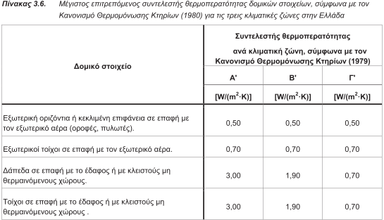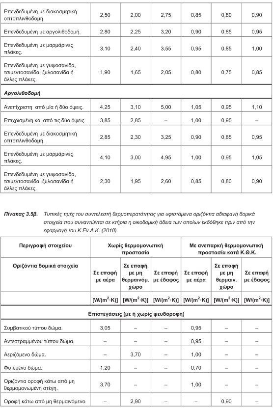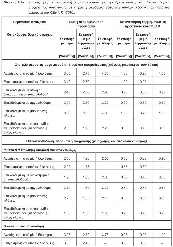 4.2.2.1. Αδιαφανή δομικά στοιχεία σε επαφή με τον εξωτερικό αέρα: Οι συντελεστές θερμοπερατότητας των αδιαφανών δομικών στοιχείων για τα κτήρια της 1ης κατηγορίας μπορούν να υπολογιστούν με βάση τη μεθοδολογία που περιγράφεται στην τεχνική οδηγία «Θερμοφυσικές ιδιότητες δομικών υλικών και έλεγχος της θερμομονωτικής επάρκειας των κτηρίων» ή να ληφθούν απευθείας από τον πίνακα3.5. (3.5α. ή 3.5β.). Ιδιαίτερη προσοχή πρέπει να δοθεί στις περιπτώσεις που έχει γίνει κάποια ανακαίνιση στο κτήριο για βελτίωση της θερμικής του συμπεριφοράς, π.χ. θερμομόνωση δώματος. Γι' αυτό το λόγο, κατά την ενεργειακή επιθεώρηση ο μηχανικός θα πρέπει να αναζητά ενδείξεις για μεταγενέστερες επεμβάσεις σε εξωτερικά δομικά στοιχεία, π.χ. έντονη ανισοσταθμία μεταξύ εσωτερικού και εξωτερικού δαπέδου στην απόληξη του κλιμακοστασίου, αυξημένο πάχος των εξωτερικών τοιχοποιιών κ.ά. Oι συντελεστές θερμοπερατότητας των αδιαφανών δομικών στοιχείων για τα κτήρια της 2ης κατηγορίας, μπορούν να ληφθούν ίσοι με τις τιμές που προβλέπονται από τη μελέτη θερμομόνωσης που συνοδεύει την οικοδομική άδεια, εφόσον διαπιστωθεί ότι αυτή εφαρμόστηκε στη φάση κατασκευής. Στην περίπτωση που η οικοδομική άδεια δεν υπάρχει, μπορούν να χρησιμοποιηθούν οι τιμές που δίνονται στον πίνακα 3.6., οι οποίες αντιστοιχούν στις μέγιστες επιτρεπόμενες τιμές του συντελεστή θερμοπερατότητας δομικών στοιχείων του Κανονισμού Θερμομόνωσης Κτηρίων. Για κτήρια που φέρουν πετάσματα και ανήκουν στην 1η και 2η κατηγορία θα λαμβάνονται οι συντελεστές θερμοπερατότητας που υπάρχουν στη μελέτη θερμομόνωσης και στη μελέτη κλιματισμού. Στην περίπτωση που δεν υπάρχουν διαθέσιμα στοιχεία για τα αδιαφανή τμήματα που αποτελούνται από πετάσματα που έχουν θερμομόνωση θα λαμβάνεται U=1 [W/(m2 .K)], ενώ για τα αδιαφανή που αποτελούνται από ύαλο και δεν έχουν επιπλέον θερμομόνωση θα λαμβάνονται οι τιμές που δίνονται στον πίνακα 3.8. Οι συντελεστές θερμοπερατότητας των αδιαφανών δομικών στοιχείων για τα κτήρια της 3ηςκαι 4ηςκατηγορίας μπορούν να ληφθούν ίσοι με τις τιμές που προβλέπονται από τη μελέτη ενεργειακής απόδοσης που συνοδεύει την οικοδομική άδεια. Ο ενεργειακός επιθεωρητής πρέπει να διασταυρώσει τόσο την ποιότητα, όσο και την ποσότητα των θερμομονωτικών υλικών που χρησιμοποιήθηκαν στην κατασκευή, συγκεντρώνοντας τα πιστοποιητικά και τα δελτία αποστολής τους από το μελετητή μηχανικό ή τον ιδιοκτήτη. Σε περίπτωση που με βάση το στέλεχος έκδοσης οικοδομικής άδειας αποδεικνύεται ότι υπήρξε και κατατέθηκε, στην οικεία υπηρεσία δομήσης, μελέτη θερμομονωτικής προστασίας ή μελέτη ενεργειακής απόδοσης και δεν συντρέχει εμφανής λόγος αμφισβήτησης της εφαρμογής της, αλλά ωστόσο δεν υφίσταται πλέον η ίδια η μελέτη (λόγω απώλειας, καταστροφής κ.τ.λ.), τότε ο ενεργειακός επιθεωρητής είναι υποχρεωμένος να διεξαγάγει την επιθεώρηση, λαμβάνοντας ως τιμές των συντελεστών θερμοπερατότητας U των επί μέρους δομικών στοιχείων τις μέγιστες επιτρεπόμενες του αναθεωρημένου Κ.Εν.Α.Κ.
