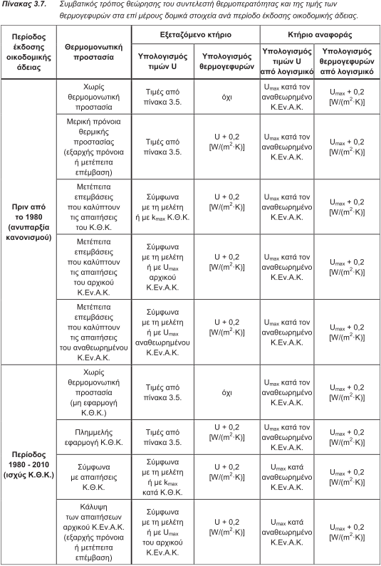 Ως τέτοια αποδεικτικά στοιχεία που πιστοποιούν την ποιότητα των χρησιμοποιούμενων υλικών μπορούν, για παράδειγμα, να θεωρηθούν: Η πιστοποίηση που είχε για τα προϊόντα της μια εταιρεία και αποδεικνύεται με τιμολόγια αγοράς ή δελτία αποστολής ότι αυτά τα υλικά χρησιμοποιήθηκαν για την ανέγερση του επιθεωρούμενου κτηρίου. Αντιθέτως, δεν θεωρούνται ως αποδεικτικά στοιχεία οι βεβαιώσεις ή άλλα πιστοποιητικά που εκδίδονται εκ των υστέρων, προκειμένου να τεκμηριώσουν την ποιότητα των υλικών που είχαν παλαιότερα χρησιμοποιηθεί. Συμβολαιογραφική πράξη, ιδιωτικό συμφωνητικό ή οποιοδήποτε άλλο επίσημο έγγραφο μεταξύ πωλητή και αγοραστή του κτηρίου, από το οποίο σαφώς προκύπτει και χωρίς περιθώρια αμφισβήτησης η ποιότητα και τα θερμοτεχνικά χαρακτηριστικά των χρησιμοποιηθέντων υλικών. Το αποτέλεσμα διερευνητικής τομής που θα γίνει σε επί μέρους δομικά στοιχεία, εφόσον το απαιτήσει ο ιδιοκτήτης. Σ' αυτήν την περίπτωση το οικονομικό κόστος διενέργειας της τομής και αποκατάστασης της φθοράς αναλαμβάνει εξ ολοκλήρου ο ιδιοκτήτης. Σε περίπτωση που με βάση το στέλεχος έκδοσης οικοδομικής άδειας αποδεικνύεται ότι υπήρξε και κατατέθηκε, στην οικεία υπηρεσία δόμησης, μελέτη θερμομονωτικής προστασίας ή μελέτη ενεργειακής απόδοσης και δεν συντρέχει εμφανής λόγος αμφισβήτησης της εφαρμογής της, αλλά ωστόσο δεν υφίσταται πλέον η ίδια η μελέτη (λόγω απώλειας, καταστροφής κ.τ.λ.), τότε ο ενεργειακός επιθεωρητής είναι υποχρεωμένος να διεξαγάγει την επιθεώρηση, λαμβάνοντας ως τιμές των συντελεστών θερμοπερατότητας U των επί μέρους δομικών στοιχείων τις μέγιστες επιτρεπόμενες του ισχύοντος κατά την περίοδο έκδοσης της οικοδομικής άδειας κανονισμού (kmax του Κ.Θ.Κ. ή Umax του Κ.Εν.Α.Κ.). Σε κτήρια που μελετήθηκαν ή ανακαινίστηκαν ριζικώς στην περίοδο μεταξύ της εφαρμογής του Κ.Εν.Α.Κ. (2010) και πριν από την εφαρμογή του αναθεωρημένου Κ.Εν.Α.Κ. (2017), είναι απαραίτητο, για την έκδοση του πιστοποιητικού ενεργειακής απόδοσης, να προσκομισθούν στον ενεργειακό επιθεωρητή ως στοιχεία που διασφαλίζουν την ορθή τήρηση του κανονισμού: Η υπογεγραμμένη από το μηχανικό μελέτη ενεργειακής απόδοσης που κατατέθηκε στην οικεία υπηρεσία δόμησης. Τα δελτία αποστολής των οικοδομικών υλικών που χρησιμοποιήθηκαν για τη θερμομονωτική προστασία του κτηρίου κατά την ανέγερση ή ανακαίνισή του και στα οποία θα πρέπει υποχρεωτικά να αναγράφεται ο τύπος των υλικών και να συνοδεύονται από τα απαραίτητα πιστοποιητικά. Φωτογραφικό υλικό κατά την φάση κατασκευής στο οποίο θα φαίνεται με ευκρίνεια ο τρόπος τοποθέτησης και το είδος της θερμομόνωσης που εφαρμόστηκε στο κτηριακό κέλυφος. Σε τουλάχιστον μία φωτογραφία θα πρέπει να παρουσιάζεται μια γενική άποψη του κτηρίου. Συνοπτικά τα παραπάνω καταγράφονται στον πίνακα 3.7. Συγκεκριμένα, σ' αυτόν καταγράφονται κατά κατηγορία και υποκατηγορία κτηρίων ο τρόπος θεώρησης του συντελεστή θερμοπερατότητας U (ή του k σύμφωνα με τον Κ.Θ.Κ.) και ο τρόπος υπολογισμού των θερμογεφυρών, ούτως ώστε ο ενεργειακός επιθεωρητής να έχει έναν κατευθυντήριο οδηγό στο έργο του. Αναλυτικά, η εκτίμηση του συντελεστή θερμοπερατότητας των αδιαφανών δομικών στοιχείων γίνεται ακολουθώντας τον τρόπο που περιγράφεται στις επόμενες ενότητες, ο οποίος διαφοροποιείται ανάλογα με τη θέση του δομικού στοιχείου στο κτηριακό περίβλημα και του μέσου που το περιβά