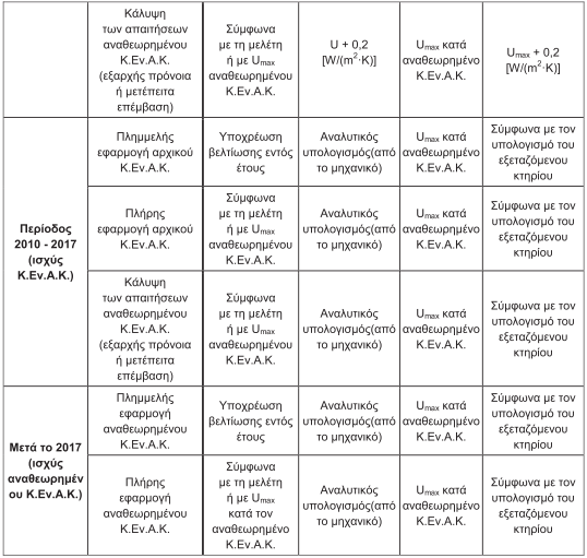 4.2.2. Συντελεστής θερμοπερατότητας αδιαφανών δομικών στοιχείων: Στη μελέτη ενεργειακής απόδοσης, ο συντελεστής θερμοπερατότητας των αδιαφανών δομικών στοιχείων υπολογίζεται με τον τρόπο που αναλύεται στην αναθεωρημένη τεχνική οδηγία «Θερμοφυσικές ιδιότητες δομικών υλικών και έλεγχος της θερμομονωτικής επάρκειας των κτηρίων». Κατά την ενεργειακή επιθεώρηση, ο ενεργειακός επιθεωρητής καλείται να εκτιμήσει τη θερμική συμπεριφορά των αδιαφανών δομικών στοιχείων, λαμβάνοντας υπόψη και το έτος έκδοσης της οικοδομικής άδειας του κτηρίου. Προς αυτή την κατεύθυνση κωδικοποιούνται για τον έλεγχο της ενεργειακής επιθεώρησης όλα τα κτήρια σε επί μέρους κατηγορίες, σύμφωνα με την περίοδο μελέτης τους και το βαθμό της θερμομονωτικής τους προστασίας. Ειδικότερα, ως προς την περίοδο έκδοσης της οικοδομικής άδειας ο διαχωρισμός γίνεται σε 3 γενικές κατηγορίες: 1η κατηγορία . Περιλαμβάνει τα κτήρια εκείνα, των οποίων η οικοδομική άδεια έχει εκδοθεί πριν από την εφαρμογή του Κανονισμού Θερμομόνωσης Κτηρίων (4 Ιουλίου 1979), χρονική περίοδο κατά την οποία δεν υπήρχε καμία απαίτηση για θερμομονωτική προστασία του κτηριακού κελύφους. Πρακτικά, ως τυπική ημερομηνία οριοθέτησης της παραπάνω περιόδου ορίζεται η 1η Ιανουαρίου 1980 . 2η κατηγορία. Περιλαμβάνει τα κτήρια εκείνα, των οποίων η οικοδομική άδεια εκδόθηκε κατά την περίοδο 1979 - 2010, δηλαδή στο διάστημα των 30 ετών που μεσολάβησε από την ισχύ του Κανονισμού Θερμομόνωσης Κτηρίων (Κ.Θ.Κ) μέχρι την ισχύ του Κανονισμού Ενεργειακής Απόδοσης των Κτηρίων (Κ.Εν.Α.Κ.). Σ' αυτό το διάστημα όλα τα κτήρια όφειλαν να πληρούν τις απαιτήσεις του Κανονισμού Θερμομόνωσης Κτηρίων. Πρακτικά, ως τυπικές ημερομηνίες οριοθέτησης της περιόδου ορίζονται: – η 1η Ιανουαρίου 1980 ως ημερομηνία έναρξης της περιόδου και – η 1η Οκτωβρίου 2010 ως ημερομηνία λήξης της περιόδου. 3η κατηγορία. Περιλαμβάνει τα κτήρια εκείνα, των οποίων η οικοδομική άδεια εκδόθηκε μετά την εφαρμογή του Κ.Εν.Α.Κ. (2010) και μέχρι την αναθεώρησή του (2017). . Πρακτικά, ως τυπικές ημερομηνίες οριοθέτησης της περιόδου ορίζονται: – η 1η Οκτωβρίου 2010 ως ημερομηνία έναρξης της περιόδου και – η ΧΧΧ 2017 ως ημερομηνία λήξης της περιόδου. 4η κατηγορία. Περιλαμβάνει τα κτήρια εκείνα, των οποίων η οικοδομική άδεια εκδόθηκε μετά την αναθεώρηση του Κ.Εν.Α.Κ. (2017) και τα οποία έχουν την υποχρέωση συμμόρφωσης προς τις νέες απαιτήσεις του κανονισμού. Στην τελευταία κατηγορία υπάγονται και όσα κτήρια ανεγέρθηκαν πριν από την ισχύ του αναθεωρημένου Κ.Εν.Α.Κ. αλλά υπέστησαν ή πρόκειται να υποστούν, μετά την έναρξη ισχύος του νέου κανονισμού ριζική ανακαίνιση. Σύμφωνα με όσα αναφέρονται στο άρθρο 49 παρ.1 του ν. 4409/2016 (ΦΕΚ Α’ 136), κάθε επέμβαση σε κτήριο ή κτηριακή μονάδα νοείται ως «ριζική ανακαίνιση» όταν η συνολική δαπάνη της ανακαίνισης που αφορά το κέλυφος του κτιρίου ή της κτιριακής μονάδας ή τα τεχνικά συστήματά τους υπερβαίνει το είκοσι πέντε τοις εκατό (25%) της τρέχουσας αξίας του κτιρίου ή της κτιριακής μονάδας, βάσει του ελαχίστου κόστους οικοδόμησης, εξαιρουμένης της αξίας του οικοπέδου επί του οποίου έχει κατασκευαστεί το κτίριο. Ανάλογα με την πρόνοια για θερμομονωτική προστασία του κτηρίου που έχει ληφθεί, η κάθε κατηγορία υποδιαιρέθηκε σε μικρότερες υποκατηγορίες: σε κτήρια χωρίς καμία πρόνοια θερμομονωτικής προστασίας, σε κτήρια με μερική ή πλημμελή θερμομονωτική προστ