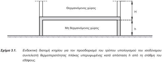4.2.2.2. Αδιαφανή δομικά στοιχεία σε επαφή με το έδαφος: Η ροή θερμότητας από ένα δομικό στοιχείο που έρχεται σε επαφή με το έδαφος είναι ένα σύνθετο τρισδιάστατο φαινόμενο που εξαρτάται από πολλές παραμέτρους, βασικότερες των οποίων είναι: η θερμική αγωγιμότητα του εδάφους, το πάχος του στρώματος εδάφους που το διαχωρίζει από τον εξωτερικό αέρα, η γεωμετρία του κτηρίου, η ίδια η θερμική αντίσταση του δομικού στοιχείου. Για να γίνει εφικτή η απλοποιητική παραδοχή της μονοδιάστατης ροής θερμότητας, γίνεται χρήση του ισοδύναμου συντελεστής θερμοπερατότητας U΄, ο οποίος, όταν πρόκειται για κατακόρυφο δομικό στοιχείο, υπολογίζεται συναρτήσει: του ονομαστικού συντελεστή θερμοπερατότητας U του δομικού στοιχείου και του βάθους z, μέχρι το οποίο φτάνει το δομικό στοιχείο. ενώ όταν πρόκειται για οριζόντιο δομικό στοιχείο υπολογίζεται συναρτήσει: του ονομαστικού συντελεστή θερμοπερατότητας U του δομικού στοιχείου, του βάθους έδρασης z του δομικού στοιχείου και της χαρακτηριστικής διάστασης της πλάκας (Β’), η οποία ορίζεται από το εμβαδό του οριζόντιου δομικού στοιχείου (Α) και την εκτεθειμένη περίμετρό του (Π). σύμφωνα με τη σχέση: . Όταν η εξεταζόμενη πλάκα έρχεται περιμετρικά σε επαφή με το έδαφος, τότε ως εκτεθειμένη περίμετρος θεωρείται η περίμετρος της πλάκας. Όταν η εξεταζόμενη πλάκα σε κάποια πλευρά της έρχεται σε επαφή με άλλα κτήρια ή με τον ελεύθερο εξωτερικό αέρα (λόγω ενδεχόμενης κλίσης του εδάφους), τότε το μήκος εκείνης της πλευράς δεν συνυπολογίζεται στην έκταση της περιμετρικής επιφάνειας και η εκτεθειμένη περίμετρος της πλάκας ισούται με το άθροισμα των μηκών των πλευρών της που δεν έρχονται σε επαφή με τα όμορα κτίσματα με τον ελεύθερο εξωτερικό αέρα. Ομοίως, όταν από κάποια πλευρά της περιμέτρου της πλάκας υπάρχει μη θερμαινόμενος χώρος του ίδιου κτηρίου, εκείνη η πλευρά δεν συνυπολογίζεται στο άθροισμα των μηκών των πλευρών της περιμέτρου. Ο ονομαστικός συντελεστής θερμοπερατότητας δομικού στοιχείου σε επαφή με το έδαφος υπολογίζεται με τον ίδιο τρόπο με αυτόν που υπολογίζεται για δομικά στοιχεία σε επαφή με εξωτερικό αέρα, λαμβάνοντας όμως μηδενική θερμική αντίσταση αέρα στην εξωτερική παρειά τους. Για το κτήριο αναφοράς ο ονομαστικός συντελεστής θερμοπερατότητας δομικού στοιχείου σε επαφή με το έδαφος ισούται με το μέγιστο επιτρεπτό για την κλιματική ζώνη που ανήκει το κτήριο (πίνακας 3.4α.). Για τη μελέτη ενεργειακής απόδοσης, ο συντελεστής θερμοπερατότητας του δομικού στοιχείου που είναι σε επαφή με το έδαφος προσδιορίζεται με τον τρόπο που αναλύεται στην τεχνική οδηγία «Θερμοφυσικές ιδιότητες δομικών υλικών και έλεγχος της θερμομονωτικής επάρκειας των κτηρίων». Για την ενεργειακή επιθεώρηση, ο ισοδύναμος συντελεστής θερμοπερατότητας δομικού στοιχείου σε επαφή με το έδαφος προσδιορίζεται από το λογισμικό, βάσει των πινάκων 8α (οριζόντια δομικά στοιχεία) και τον πίνακα 8β (κατακόρυφα δομικά στοιχεία) της αναθεωρημένης τεχνικής οδηγίας Τ.Ο.Τ.Ε.Ε. 20701-2, λαμβάνοντας τον ονομαστικό συντελεστή θερμοπερατότητας του δομικού στοιχείου σε επαφή με το έδαφος για κάθε κατηγορία κτηρίων ως εξής: Για τα κτήρια της 1ης κατηγορίας από τον πίνακα 3.5. (3.5α. ή 3.5β.). Για τα κτήρια της 2ης κατηγορίας από τη μελέτη θερμομόνωσης, εφόσον διαπιστωθεί ότι αυτή εφαρμόστηκε στη φάση κατασκευής. Στην περίπτωση που αυτή δεν υπάρχει, μπορούν 